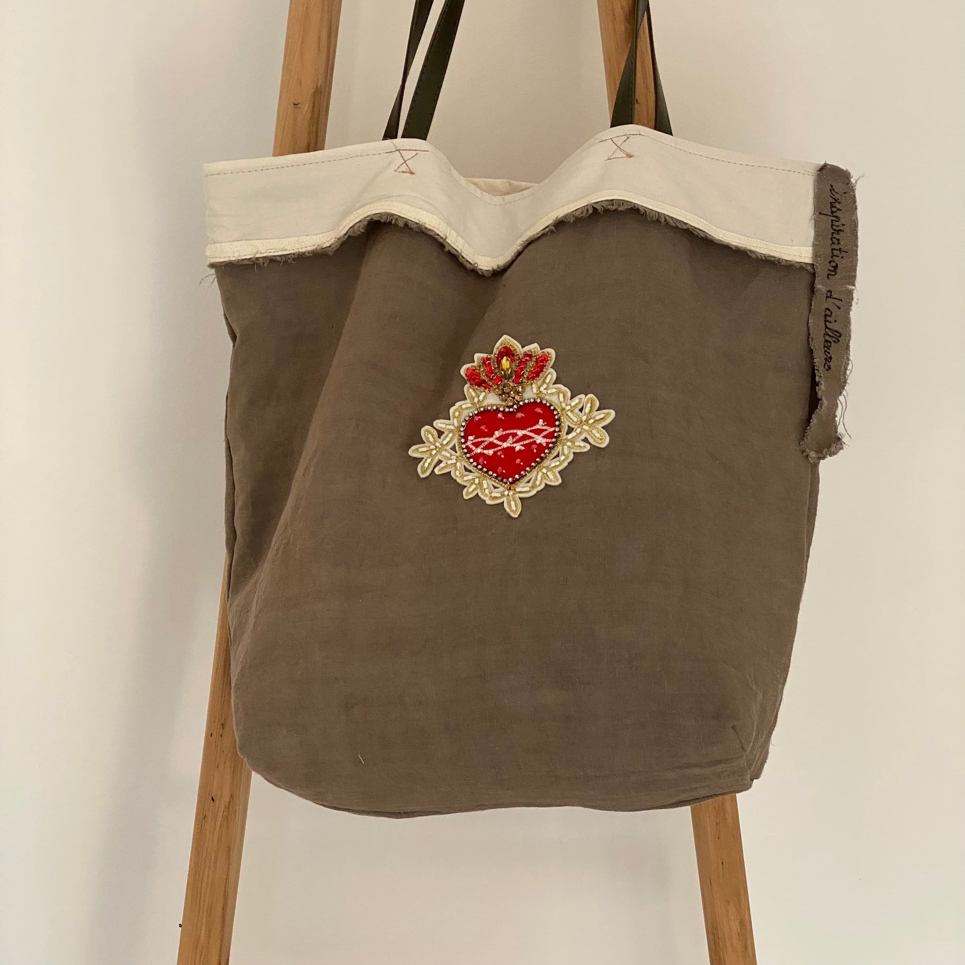 Un cabas artisanal en drap ancien kaki et beige, sublimé par un écusson cœur.