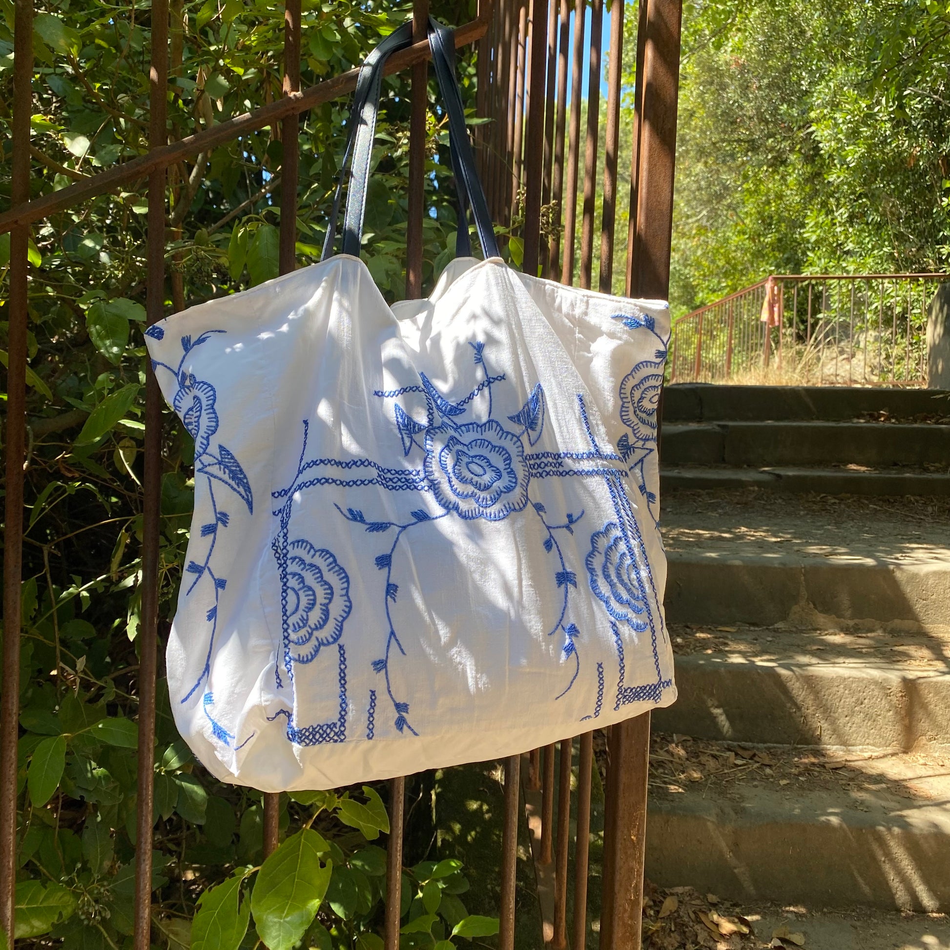 cabas Berthe est confectionné à partir de vieux napperons en lin ancien sublimés de broderies bleues fleuries. Chaque pièce est unique, mettant en valeur le savoir-faire artisanal et la délicatesse des motifs d’antan.